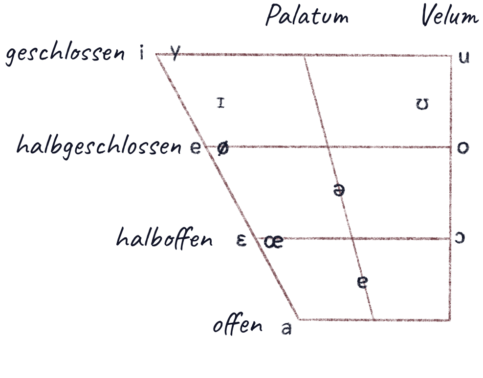 Die vertikale Achse zeigt die Zungenhöhe (geschlossen – halbgeschlossen – offen), während die horizontale Achse die Zungenlage (vorn – zentral – hinten) darstellt.