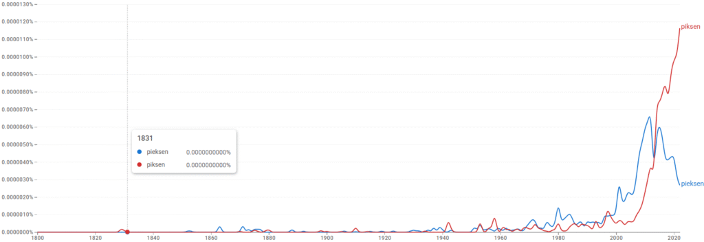 Die Verbreitung von „piksen“ und „pieksen“ in deutschsprchigen Büchern. Quelle: Google Books Ngram Viewer